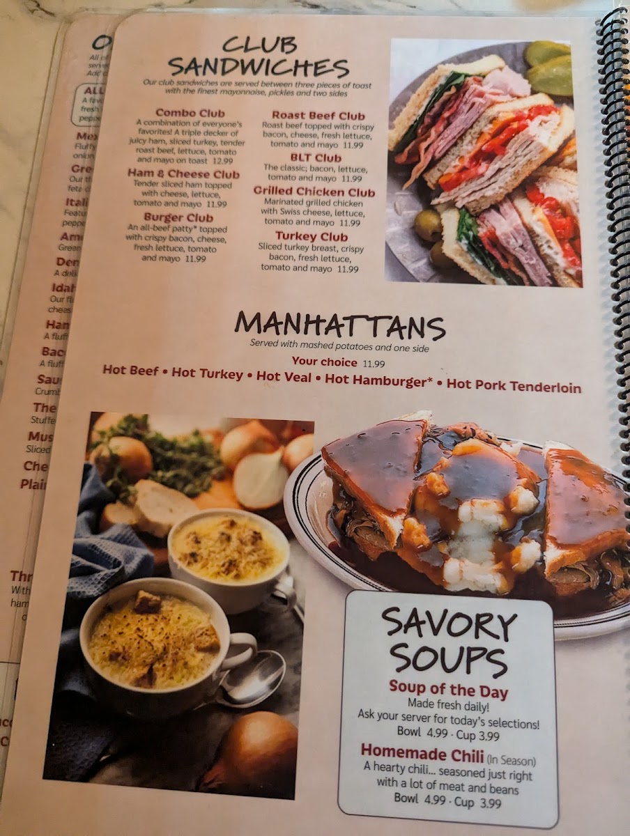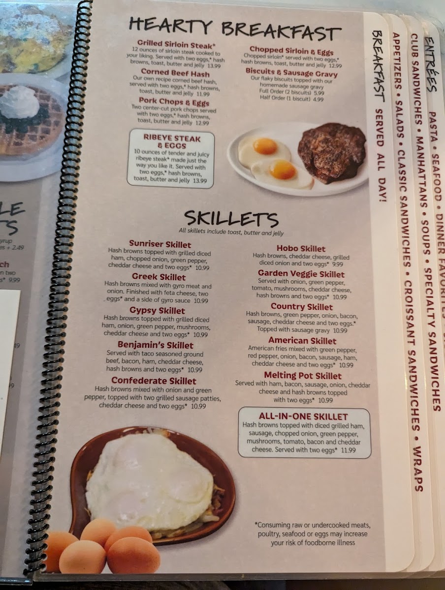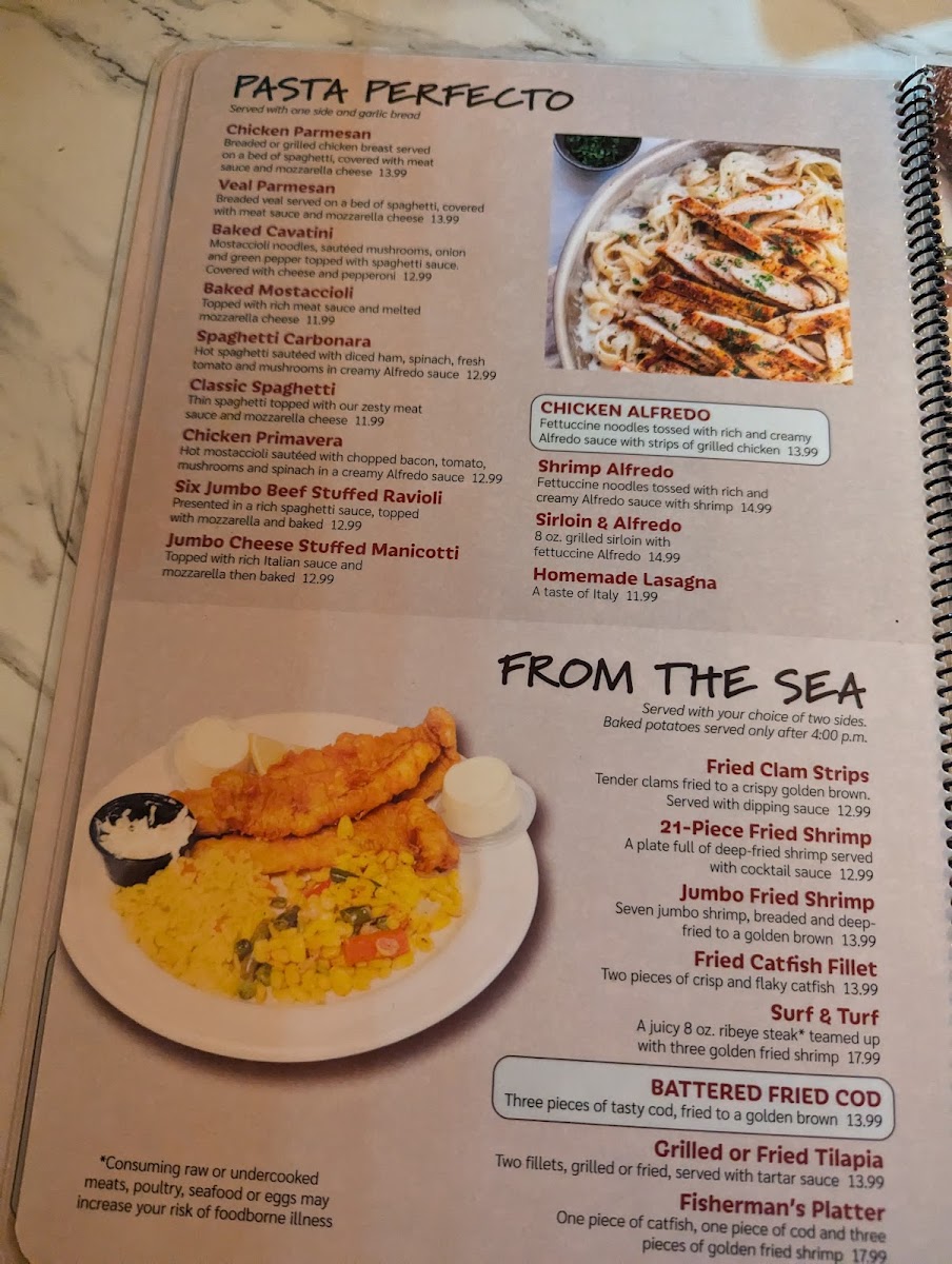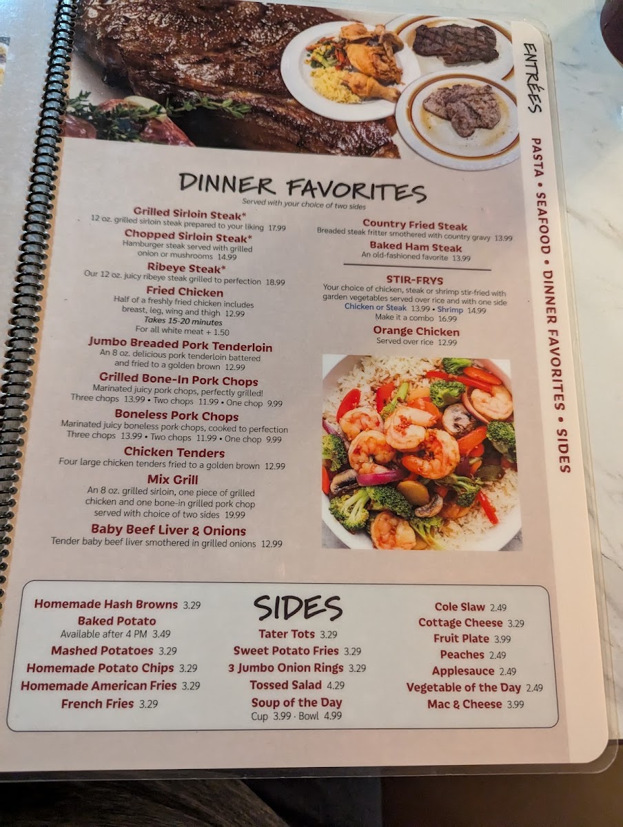 Many guests find themselves enjoying breakfast plates or a warm bowl of chicken noodle soup to start the day, while the dinner selection includes hearty steaks, grilled pork chops, and comforting pasta dishes ideal for a relaxed evening meal. Sides like crispy tater tots and fried okra complement the main dishes perfectly, adding a little extra to a familiar dining experience.